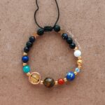 Adjustable bracelet with rubberized beads and representations of the planets in our solar system.