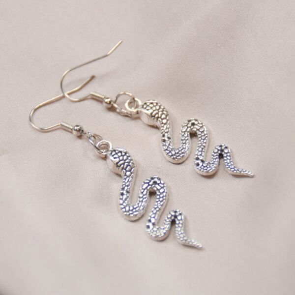 Silver dangling snake earrings.